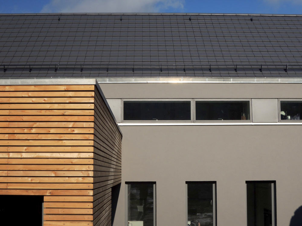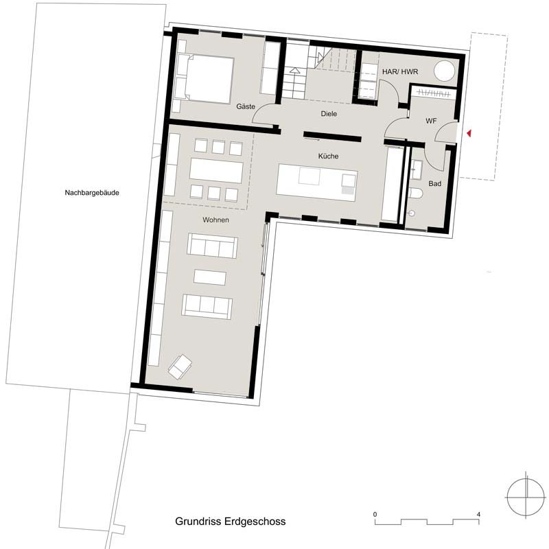 An der Stelle des alten, nicht sanierbaren Wohnhauses wurde in zeitgemäßer Interpretation ein klarer Neubau entwickelt, der durch mehr Höhe, individuelle Raumkonstellationen und die Erweiterung des Wohnbereiches in den Garten hinein, die Vorstellungen und Anforderungen der Bauherrnschaft aufnimmt. Das lange, alte Nebengebäude wird Stück für Stück, einem „roten Faden“ folgend ertüchtigt.