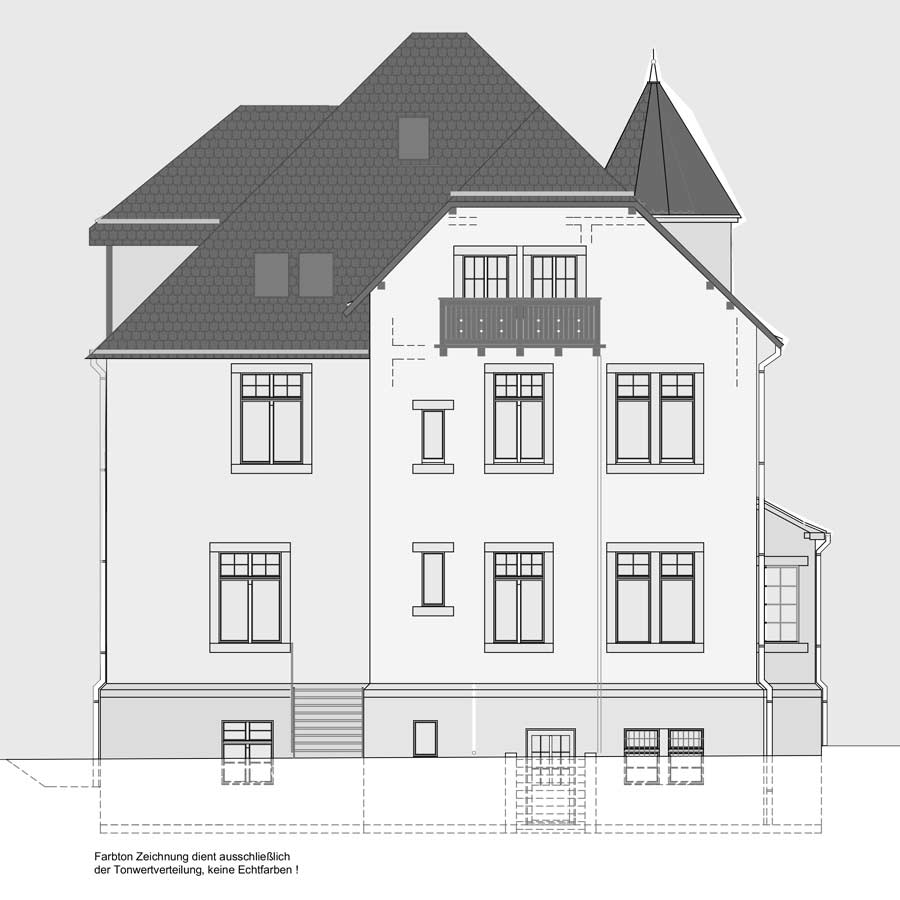 Umbau und Sanierung in Sockel- und Erdgeschoss und Balkonanbau im Dachgeschoss, Fassaden