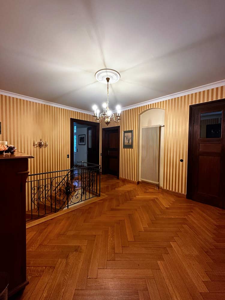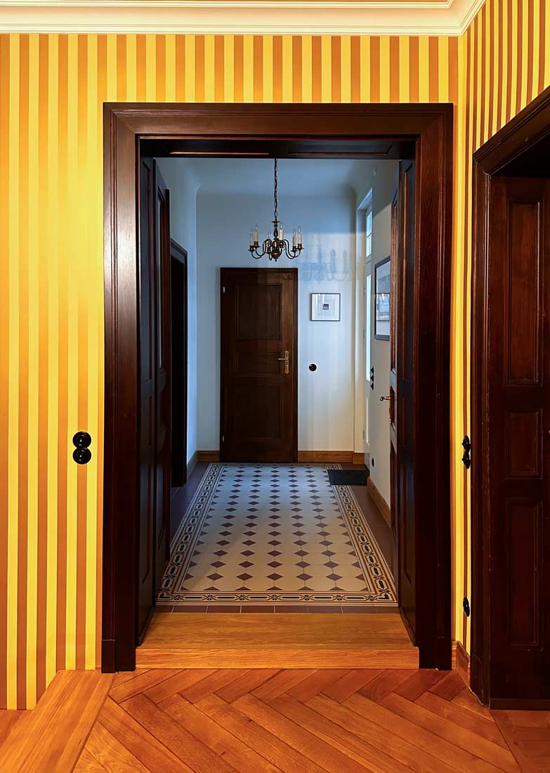 Die Stadtvilla im näheren Umfeld des Waldparks Dresden-Blasewitz, erbaut nach Plänen des Architekten K.E. Scherz, erfuhr vor allem in der näheren Vergangenheit einige innere Umbauten, die der neue Eigentümer und Bewohner bei der Sanierung der unteren Etagen unter Hinzunahme aller verfügbaren historischen Quellen und Funde wieder in den historischen Kontext setzen wollte. So wurde die wohnungsinnere Treppe wieder hergestellt, die vorhandenen Wandvertäfelungen restauratorisch aufgearbeitet, zu ersetzende Fenster mit Hebetechnik im Wintergarten handwerklich nachgebildet, der Eingangsbereich mit den Natursteinflächen wieder ausgebildet uvm.